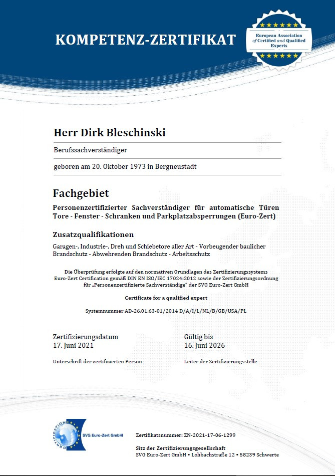 Nachstehend führen wir hier den Nachweis, dass Dirk Bleschinski über ein aktuelles Zertifizierungsschreiben verfügt, welches seine hohe Kompetenz in den angegebenen Sachgebieten belegt.